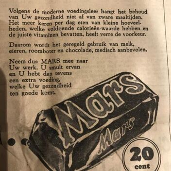 Eten en drinken Van toen 19 juni 2022 11 Candybar Mars gezond? Vroeger dachten ze van wel! In 1956 werd de candybar Mars als gezond gezien. Het was in de jaren ‘60 daarom een zeer verantwoorde keuze én de snack ... SchoolBANK redacteur Ilse