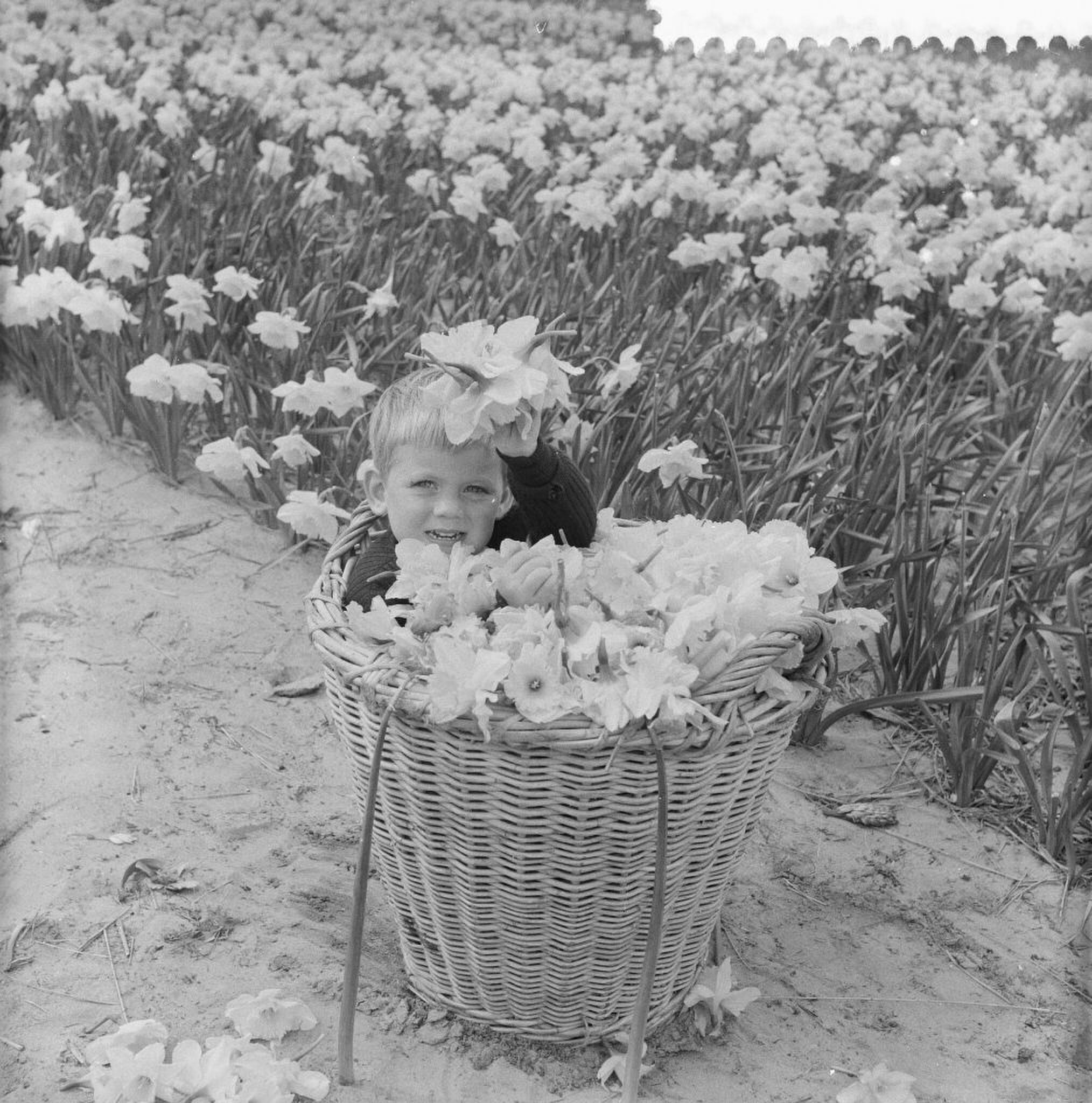 Waar nu allemaal woningen staan waren vijftig jaar geleden de bloembollenboeren nog volop aanwezig. Zo ook vlak bij mijn huis en m’n vriendjes namen me mee. Tot mijn stomme verbazing stond ik ineens middenin een veld vol prachtige gele bloemen, het voorjaar was begonnen! En in datzelfde veld stond ook de boer. Hoewel de narcissen eigenlijk bedoeld waren voor de bollenteelt was er ook een gedeelte gereserveerd voor de bloemenverkoop. En ja hoor, de boer had al een grote stapel met bosjes narcissen gemaakt, vulde er rieten manden mee en daar kreeg je er zomaar een van in je handen geduwd! “Ga maar lekker langs de deur verkopen jongens”, bromde hij. Nou dat liet ik me geen twee keer zeggen, wat een handel. Inkoop een gulden, verkoop een gulden en vijftig cent, dus als je acht bosjes had verkocht dan, dan… kon je weer een nieuw singeltje kopen!