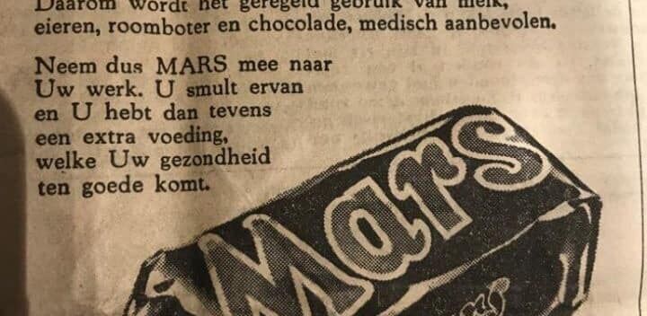 Eten en drinken Van toen 19 juni 2022 11 Candybar Mars gezond? Vroeger dachten ze van wel! In 1956 werd de candybar Mars als gezond gezien. Het was in de jaren ‘60 daarom een zeer verantwoorde keuze én de snack ... SchoolBANK redacteur Ilse
