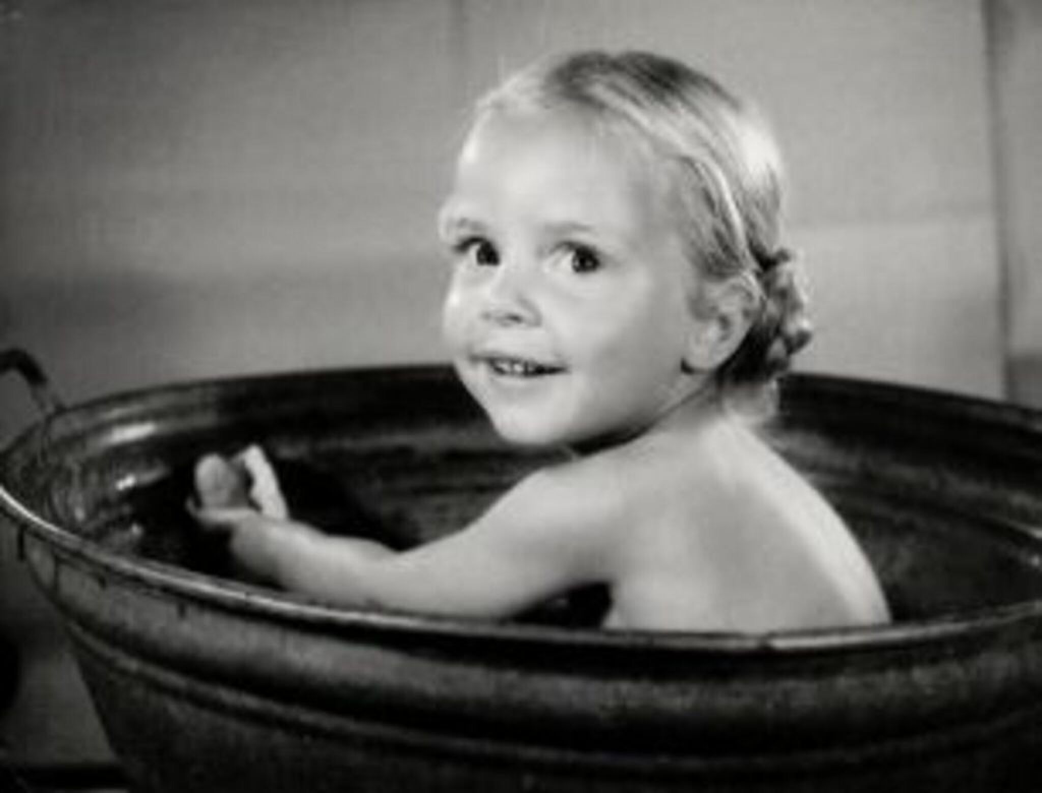 Mijn moeder plaatste die zinken teil dan midden in de keuken. Mijn vader kookte water in een grote fluitketel en dan kon het ritueel op gang komen. Uitkleden en voorzichtig in de teil stappen. Ma bekommerde zich om het wassen terwijl pa de watertemperatuur regelde door af en toe een scheut heet water toe te voegen. Er werden heel veel handdoeken rondom de teil gelegd want je spetterde nogal. Dit tot ongenoegen van mn ouders. Na lichamelijk te zijn gereinigd kwam er een stuk Sunlight zeep aan te pas om de haren te wassen. Ogen dichtknijpen en ma ging dan met de handen stevig door de toen nog aanwezige krullenbol. Eigenlijk was het afspoelen het leukste. Mijn moeder nam dan een steelpannetje en goot daarmee, met regelmatige tussenpozen, een flinke scheut water over het hoofd. Afdrogen en pyjama aan en naar bed. Zo zag het wekelijkse was ritueel er uit. Meestal ging mijn zusje eerst en daarna was ik aan de beurt.