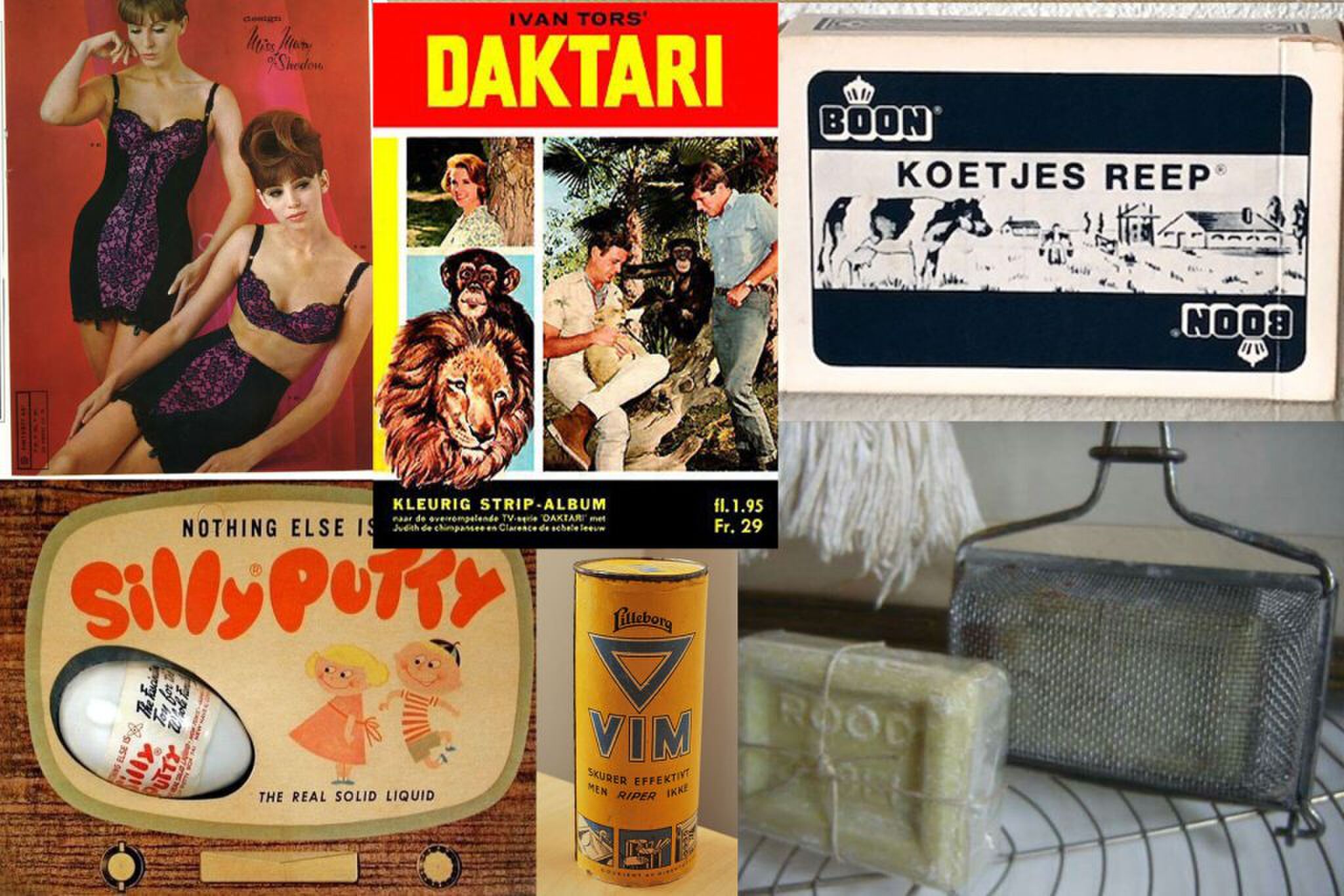 Een deel van deze items zijn echt van (ver) voor de jaren 60 en 70. De ‘geblokte gootsteen’ is eigenlijk al van voor de tweede wereldoorlog, evenals de zeepklopper. En de getoonde VIM-bus en koetjesreep hadden in de jaren 60 en 70 een andere verpakking.