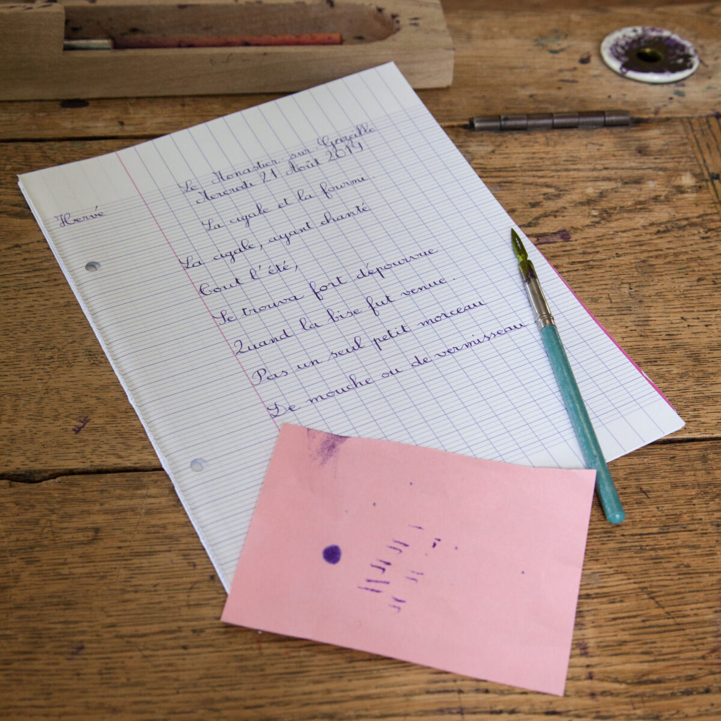 Later leerde ik dat je met de pen kon prikken en dat je er stukjes gum gedompeld in de inkt mee weg kon schieten. Pas heel veel later leerde ik echt schrijven en kalligraferen. Maar dit was niet dankzij de juf.