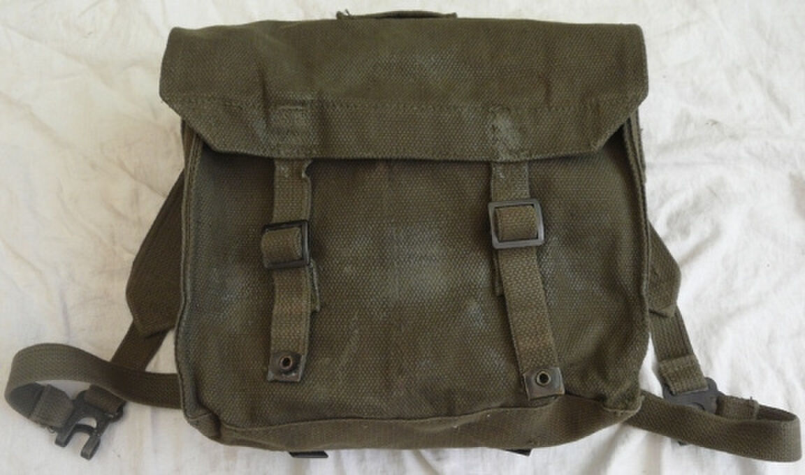 Pukkel van mijn vader gekregen, uit zij diensttijd (WW2). Hij was botenbouwer en nam zelf een grote versie van de pukkel mee naar het werk. Om die pukkel op de fiets te krijgen kon je de schouderband op z’n langst zetten en dan om je zadelpen en achterom je bagagedrager “rijgen”. Hij hing dat precies aan de zijkant op je achteras. Stond heel gaaf maar op den duur kwam er van het stuiteren, ter hoogte van je achteras een gat in je tas en als je pech had ook in het boek dat daar zat.